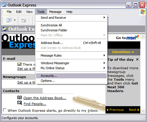 - In Microsoft Outlook Express, from the Tools menu, select Accounts.