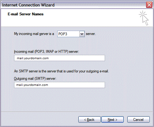 - POP mail.yourdomain.com. or IMAP mail.yourdomain.com
